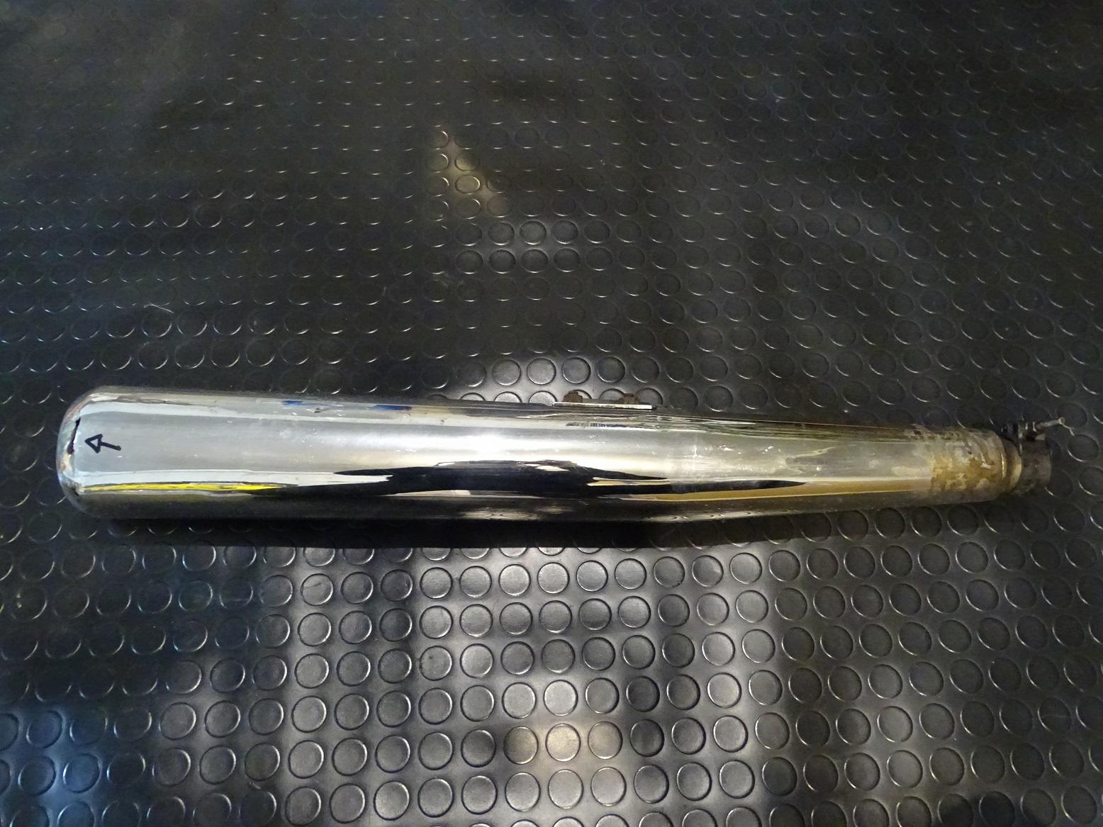La moto Guzzi V35 350 prevedeva 2 scarichi completamente cromati in abbinamento agli altri accessori della carrozzeria: il terminale sinistro è in condizioni buone, presenta però un foro nella parte posteriore come indicato dalla freccia in foto